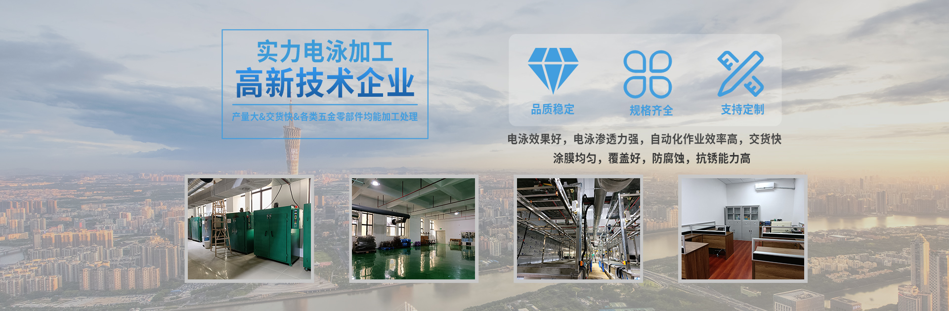 本公司創始于2004年,由專業的涂料技術專家及應用技術工程師發起并組建的高新技術企業,專業從事各類金屬電泳涂裝,是專業的電泳涂料、電泳加工及配套設備供應的高科技公司。 本公司依托多年從事電泳的經驗技術,對多種材料(銅、鋁、鐵、不銹鋼、鋅合金、鋁合金等材料)表面處理的研究,采用先進的工藝與進口原料的配合,完全可以保證客戶產品的表面涂裝,能達到出口產品的標準要求。主要電泳白色、透明、黑色和紅色、藍色、黃色、紫色等多種彩色。 憑著先進的電泳技術和嚴格的品質要求,本著以最高的客戶滿意度為目標,這幾年時間,我們已得到了精密電子五金、衛...